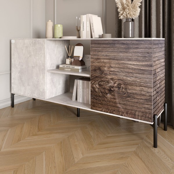 Комод відкритий на чорних металевих ніжках LION Грей Бетон/Дерево