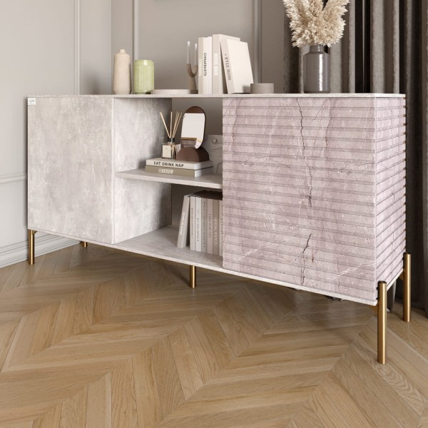 Комод открытый LION Грей Комод из коллекции «Грей» изготовлен из высококачественных материалов и станет отличным решением для современного интерьера, сочетающего лаконичность форм и изысканные текстуры. Его гладкий фасад дополнен текстурной секцией, что добавляет интересный визуальный акцент, выделяя комод на фоне других предметов мебели. Металлические ножки придают конструкции легкость, обеспечивая устойчивость и долговечность. Просторные секции внутри комода обеспечивают удобное хранение разнообразных вещей, включая одежду, постельное белье, аксессуары или документы. Благодаря своей универсальности комод будет отлично смотреться в спальне, гостиной или рабочем кабинете.   Материал изготовления Комод изготовлен из ЛДСП SWISS KRONO - высококачественного материала, сочетающего эстетику с прочностью и надежностью. ЛДСП от SWISS KRONO известен своей устойчивостью к механическим повреждениям, влаге и высоким температурам, что гарантирует долговечность мебели и сохраняет ее эстетический вид на долгие годы. Ножки комода изготовлены из металла. Варианты цвета ножек тумбы Черный Золотой Особенности Комод с тремя функциональными отделениями обеспечивает комфортное и организованное хранение вещей. Закрытые полки прекрасно подходят для белья, аксессуаров или документов, тогда как открытые секции позволяют разместить книги, декор или предметы, которые всегда должны быть под рукой. Дизайн комода гармонично сочетает гладкие и текстурные фасады, создавая интересный визуальный акцент и подчеркивая его стильную индивидуальность. Прочные золотистые металлические ножки добавляют легкости конструкции, обеспечивают устойчивость и выдерживают значительные нагрузки. Высокий просвет между полом и комодом упрощает уборку, помогая поддерживать чистоту. Минималистичный стиль без выступающих ручек добавляет современности и исключает случайные зацепы, делая комод практичным и безопасным в использовании. Размеры: Ширина: 1540 мм Глубина: 380 мм Высота: 765 мм