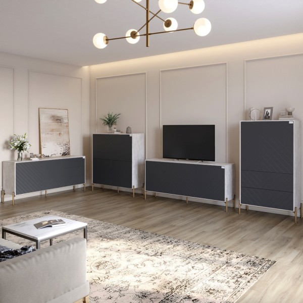 Гарнитур в гостиную 4 элемента LION Амарант Комплект мебели для гостиной LION Амарант - сочетает в себе элегантность минимализма и высокую функциональность. Стильные фасады с выразительным диагональным узором станут акцентным элементом современного интерьера. В состав комплекта входят комод, пенал, тумба ТВ, а также комод-пенал. Лаконичные линии, текстурные фасады и золотые металлические ножки создают эффектный внешний вид. Комплект идеально подходит для интерьеров в стиле минимализм, лофт или модерн. Материал изготовления Комод изготовлен из ЛДСП SWISS KRONO - высококачественного материала, сочетающего эстетику с прочностью и надежностью. ЛДСП от SWISS KRONO известен своей стойкостью к механическим повреждениям, влаге и высоким температурам, что гарантирует долговечность мебели и сохраняет ее эстетичный вид на долгие годы. Металлические ножки обеспечивают устойчивость и придают изделию современного стиля, дополняя общий образ тумбы. Особенности Модульная структура. Каждый модуль выполняет свою роль: хранение одежды, аксессуаров, книг, мультимедийной техники или декора. Возможность самостоятельной компоновки модулей позволяет адаптировать комплект к размерам и функциональным потребностям вашего помещения. Минималистичная фурнитура. Отсутствие внешних ручек делает конструкцию более лаконичной. Прочные металлические ножки. Ножки из золотого металла обеспечивают высокую устойчивость и выдерживают значительные нагрузки. Высота ножек упрощает уборку под мебелью и добавляет визуальной легкости конструкции. Кромка 2 мм - защищает края изделий от повреждений, придает им эстетически завершенный вид и повышает долговечность мебели. Кромку изготавливают из прочных материалов, что позволяет ей выдерживать интенсивное использование и сохранять привлекательный внешний вид в течение многих лет. Размеры: Комод: Ширина: 1680 мм Глубина: 400 мм Высота: 765 мм Тумба для ТВ: Ширина: 1680 мм Глубина: 400 мм Высота: 765 мм Пенал: Ширина: 840 мм Глубина: 400 мм Высота: 1500 мм Комод-пенал: Ширина: 1140 мм Глубина: 400 мм Высота: 1265 мм