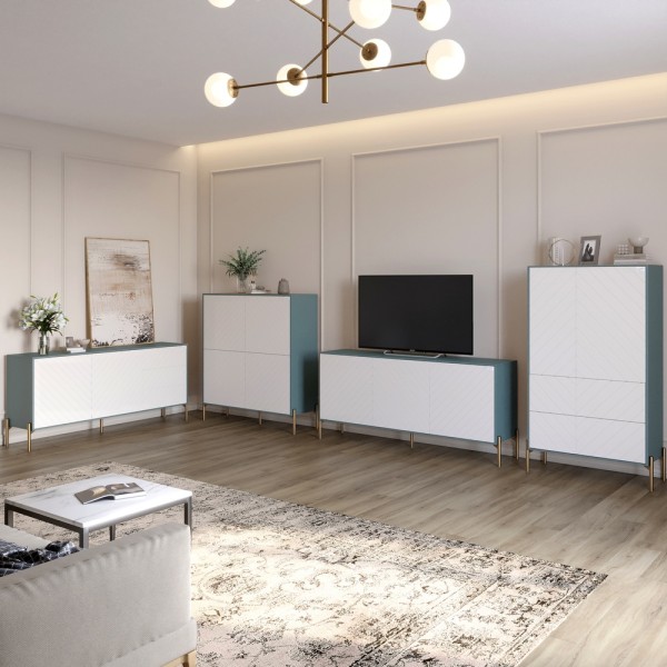Гарнитур в гостиную 4 элемента LION Амарант Комплект мебели для гостиной LION Амарант - сочетает в себе элегантность минимализма и высокую функциональность. Стильные фасады с выразительным диагональным узором станут акцентным элементом современного интерьера. В состав комплекта входят комод, пенал, тумба ТВ, а также комод-пенал. Лаконичные линии, текстурные фасады и золотые металлические ножки создают эффектный внешний вид. Комплект идеально подходит для интерьеров в стиле минимализм, лофт или модерн. Материал изготовления Комод изготовлен из ЛДСП SWISS KRONO - высококачественного материала, сочетающего эстетику с прочностью и надежностью. ЛДСП от SWISS KRONO известен своей стойкостью к механическим повреждениям, влаге и высоким температурам, что гарантирует долговечность мебели и сохраняет ее эстетичный вид на долгие годы. Металлические ножки обеспечивают устойчивость и придают изделию современного стиля, дополняя общий образ тумбы. Особенности Модульная структура. Каждый модуль выполняет свою роль: хранение одежды, аксессуаров, книг, мультимедийной техники или декора. Возможность самостоятельной компоновки модулей позволяет адаптировать комплект к размерам и функциональным потребностям вашего помещения. Минималистичная фурнитура. Отсутствие внешних ручек делает конструкцию более лаконичной. Прочные металлические ножки. Ножки из золотого металла обеспечивают высокую устойчивость и выдерживают значительные нагрузки. Высота ножек упрощает уборку под мебелью и добавляет визуальной легкости конструкции. Кромка 2 мм - защищает края изделий от повреждений, придает им эстетически завершенный вид и повышает долговечность мебели. Кромку изготавливают из прочных материалов, что позволяет ей выдерживать интенсивное использование и сохранять привлекательный внешний вид в течение многих лет. Размеры: Комод: Ширина: 1680 мм Глубина: 400 мм Высота: 765 мм Тумба для ТВ: Ширина: 1680 мм Глубина: 400 мм Высота: 765 мм Пенал: Ширина: 840 мм Глубина: 400 мм Высота: 1500 мм Комод-пенал: Ширина: 1140 мм Глубина: 400 мм Высота: 1265 мм