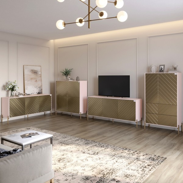 Гарнитур в гостиную 4 элемента LION Амарант Комплект мебели для гостиной LION Амарант - сочетает в себе элегантность минимализма и высокую функциональность. Стильные фасады с выразительным диагональным узором станут акцентным элементом современного интерьера. В состав комплекта входят комод, пенал, тумба ТВ, а также комод-пенал. Лаконичные линии, текстурные фасады и золотые металлические ножки создают эффектный внешний вид. Комплект идеально подходит для интерьеров в стиле минимализм, лофт или модерн. Материал изготовления Комод изготовлен из ЛДСП SWISS KRONO - высококачественного материала, сочетающего эстетику с прочностью и надежностью. ЛДСП от SWISS KRONO известен своей стойкостью к механическим повреждениям, влаге и высоким температурам, что гарантирует долговечность мебели и сохраняет ее эстетичный вид на долгие годы. Металлические ножки обеспечивают устойчивость и придают изделию современного стиля, дополняя общий образ тумбы. Особенности Модульная структура. Каждый модуль выполняет свою роль: хранение одежды, аксессуаров, книг, мультимедийной техники или декора. Возможность самостоятельной компоновки модулей позволяет адаптировать комплект к размерам и функциональным потребностям вашего помещения. Минималистичная фурнитура. Отсутствие внешних ручек делает конструкцию более лаконичной. Прочные металлические ножки. Ножки из золотого металла обеспечивают высокую устойчивость и выдерживают значительные нагрузки. Высота ножек упрощает уборку под мебелью и добавляет визуальной легкости конструкции. Кромка 2 мм - защищает края изделий от повреждений, придает им эстетически завершенный вид и повышает долговечность мебели. Кромку изготавливают из прочных материалов, что позволяет ей выдерживать интенсивное использование и сохранять привлекательный внешний вид в течение многих лет. Размеры: Комод: Ширина: 1680 мм Глубина: 400 мм Высота: 765 мм Тумба для ТВ: Ширина: 1680 мм Глубина: 400 мм Высота: 765 мм Пенал: Ширина: 840 мм Глубина: 400 мм Высота: 1500 мм Комод-пенал: Ширина: 1140 мм Глубина: 400 мм Высота: 1265 мм
