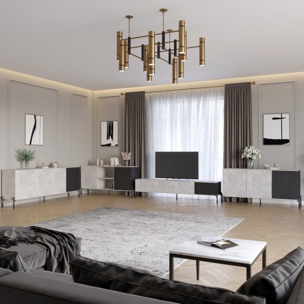 Комплект модульный 4 элемента LION Грей Комплект мебели для гостиной LION Грей - станет гармоничным дополнением вашего дома, сочетая стильный внешний вид с удобством и долговечностью. Металлические ножки обеспечивают устойчивость и легкость конструкции, а рельефные детали на фасаде добавляют оригинальности и динамичности в интерьер. В состав комплекта входят комод, комод открытый, комод закрытый, а также тумба ТВ. Комплект идеально подходит для интерьеров в стиле минимализм, лофт или модерн. Материал изготовления Комод изготовлен из ЛДСП SWISS KRONO - высококачественного материала, сочетающего эстетику с прочностью и надежностью. ЛДСП от SWISS KRONO известен своей стойкостью к механическим повреждениям, влаге и высоким температурам, что гарантирует долговечность мебели и сохраняет ее эстетичный вид на долгие годы. Металлические черные ножки обеспечивают устойчивость и придают изделию современного стиля, дополняя общий образ тумбы. Особенности Модульная структура. Комплект состоит из нескольких независимых элементов, которые можно комбинировать по вашему желанию. Это позволяет адаптировать мебель к различным пространствам. Минималистичная фурнитура. Отсутствие внешних ручек делает конструкцию более лаконичной. Прочные металлические ножки. Ножки из черного металла обеспечивают устойчивость мебели и добавляют легкости в общем виде. Высота ножек упрощает уборку под мебелью. Кромка 2 мм - защищает края изделий от повреждений, придает им эстетически завершенный вид и повышает долговечность мебели. Кромку изготавливают из прочных материалов, что позволяет ей выдерживать интенсивное использование и сохранять привлекательный внешний вид в течение многих лет. Размеры: Комод: Ширина: 2040 мм Глубина: 380 мм Высота: 765 мм Тумба для ТВ: Ширина: 2040 мм Глубина: 380 мм Высота: 465 мм Комод открытый: Ширина: 1540 мм Глубина: 380 мм Высота: 765 мм Комод закрытый: Ширина: 1540 мм Глубина: 380 мм Высота: 765 мм