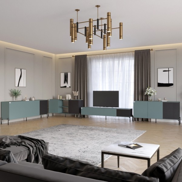 Комплект модульный 4 элемента LION Грей Комплект мебели для гостиной LION Грей - станет гармоничным дополнением вашего дома, сочетая стильный внешний вид с удобством и долговечностью. Металлические ножки обеспечивают устойчивость и легкость конструкции, а рельефные детали на фасаде добавляют оригинальности и динамичности в интерьер. В состав комплекта входят комод, комод открытый, комод закрытый, а также тумба ТВ. Комплект идеально подходит для интерьеров в стиле минимализм, лофт или модерн. Материал изготовления Комод изготовлен из ЛДСП SWISS KRONO - высококачественного материала, сочетающего эстетику с прочностью и надежностью. ЛДСП от SWISS KRONO известен своей стойкостью к механическим повреждениям, влаге и высоким температурам, что гарантирует долговечность мебели и сохраняет ее эстетичный вид на долгие годы. Металлические черные ножки обеспечивают устойчивость и придают изделию современного стиля, дополняя общий образ тумбы. Особенности Модульная структура. Комплект состоит из нескольких независимых элементов, которые можно комбинировать по вашему желанию. Это позволяет адаптировать мебель к различным пространствам. Минималистичная фурнитура. Отсутствие внешних ручек делает конструкцию более лаконичной. Прочные металлические ножки. Ножки из черного металла обеспечивают устойчивость мебели и добавляют легкости в общем виде. Высота ножек упрощает уборку под мебелью. Кромка 2 мм - защищает края изделий от повреждений, придает им эстетически завершенный вид и повышает долговечность мебели. Кромку изготавливают из прочных материалов, что позволяет ей выдерживать интенсивное использование и сохранять привлекательный внешний вид в течение многих лет. Размеры: Комод: Ширина: 2040 мм Глубина: 380 мм Высота: 765 мм Тумба для ТВ: Ширина: 2040 мм Глубина: 380 мм Высота: 465 мм Комод открытый: Ширина: 1540 мм Глубина: 380 мм Высота: 765 мм Комод закрытый: Ширина: 1540 мм Глубина: 380 мм Высота: 765 мм