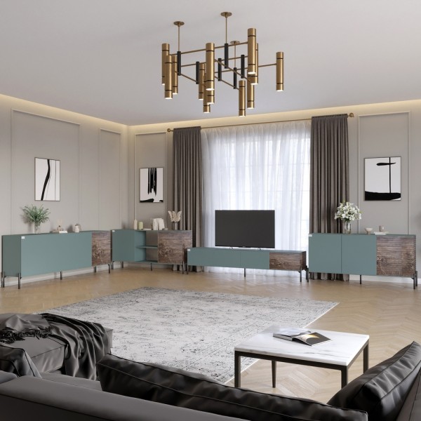 Комплект модульный 4 элемента LION Грей Комплект мебели для гостиной LION Грей - станет гармоничным дополнением вашего дома, сочетая стильный внешний вид с удобством и долговечностью. Металлические ножки обеспечивают устойчивость и легкость конструкции, а рельефные детали на фасаде добавляют оригинальности и динамичности в интерьер. В состав комплекта входят комод, комод открытый, комод закрытый, а также тумба ТВ. Комплект идеально подходит для интерьеров в стиле минимализм, лофт или модерн. Материал изготовления Комод изготовлен из ЛДСП SWISS KRONO - высококачественного материала, сочетающего эстетику с прочностью и надежностью. ЛДСП от SWISS KRONO известен своей стойкостью к механическим повреждениям, влаге и высоким температурам, что гарантирует долговечность мебели и сохраняет ее эстетичный вид на долгие годы. Металлические черные ножки обеспечивают устойчивость и придают изделию современного стиля, дополняя общий образ тумбы. Особенности Модульная структура. Комплект состоит из нескольких независимых элементов, которые можно комбинировать по вашему желанию. Это позволяет адаптировать мебель к различным пространствам. Минималистичная фурнитура. Отсутствие внешних ручек делает конструкцию более лаконичной. Прочные металлические ножки. Ножки из черного металла обеспечивают устойчивость мебели и добавляют легкости в общем виде. Высота ножек упрощает уборку под мебелью. Кромка 2 мм - защищает края изделий от повреждений, придает им эстетически завершенный вид и повышает долговечность мебели. Кромку изготавливают из прочных материалов, что позволяет ей выдерживать интенсивное использование и сохранять привлекательный внешний вид в течение многих лет. Размеры: Комод: Ширина: 2040 мм Глубина: 380 мм Высота: 765 мм Тумба для ТВ: Ширина: 2040 мм Глубина: 380 мм Высота: 465 мм Комод открытый: Ширина: 1540 мм Глубина: 380 мм Высота: 765 мм Комод закрытый: Ширина: 1540 мм Глубина: 380 мм Высота: 765 мм