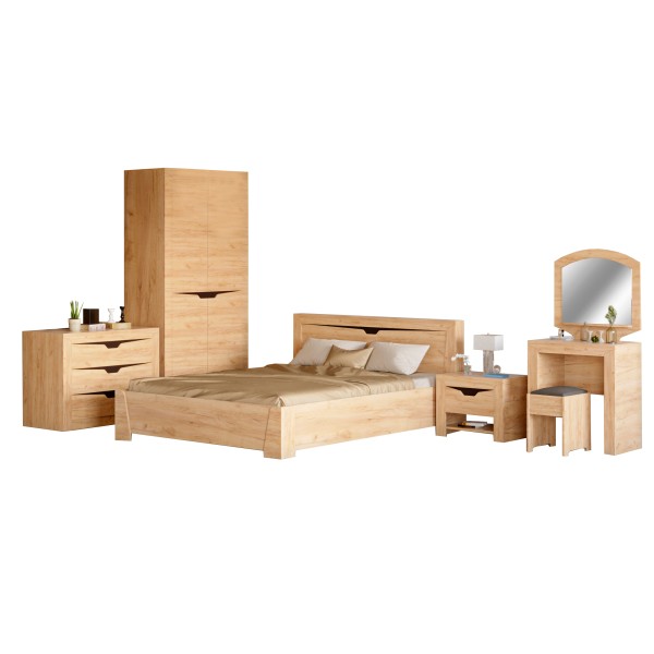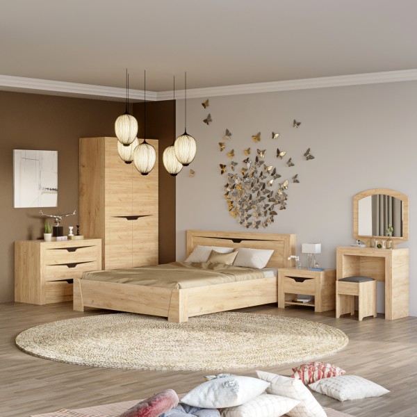 Кожен елемент комплекту виготовлений з високоякісного дуба крафт золотого кольору, що надає йому особливої елегантності та витонченості. Завдяки ретельно продуманій конструкції, усі складові гармонійно поєднуються між собою, створюючи затишну атмосферу для відпочинку та сну. Придбати цей комплект - означає інвестувати у свій комфорт та якість життя.