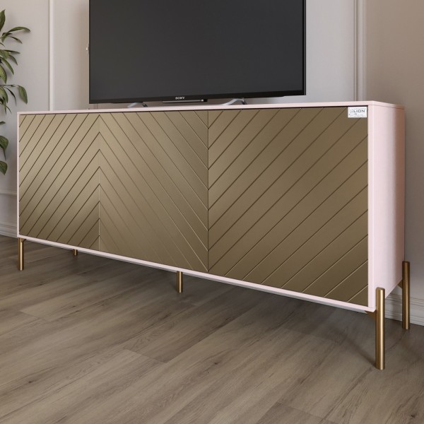 Тумба под телевизор LION Тумба ТВ от Lion - это идеальное сочетание современного дизайна и функциональности. Ее фасады украшены стильным диагональным узором, который привносит в интерьер динамику и элегантность. Лаконичный корпус дополнен высокими металлическими ножками черного цвета, которые придают тумбе легкость и обеспечивают устойчивость. Тумба LION отлично подходит для хранения мультимедийных устройств, аксессуаров и бытовых мелочей. Просторная верхняя поверхность предназначена для размещения телевизора, звуковой системы или декоративных элементов. Эта модель органично впишется в интерьер гостиной, спальни или офиса. Материал изготовления Тумба изготовлена из ЛДСП SWISS KRONO - высококачественного материала, сочетающего эстетику с прочностью и надежностью. ЛДСП от SWISS KRONO известна своей устойчивостью к механическим повреждениям, влаге и низким температурам, что обеспечивает сохранность мебели и ее эстетического вида на долгие годы. Металлические ножки обеспечивают устойчивость и придают изделию современного стиля, дополняя общий образ тумбы. Варианты цвета ножек тумбы Черный Золотой Особенности Удобство хранения. Просторная верхняя поверхность подходит для размещения телевизора, звуковых систем или декоративных элементов. Внутренние секции идеально подходят для хранения аксессуаров, мультимедийных устройств, кабелей или других предметов. Минималистичная фурнитура. Отсутствие внешних ручек делает конструкцию более лаконичной. Металлические ножки. Обеспечивают устойчивость конструкции, а так же облегчают уборку под тумбой. Кромка 2 мм - защищает края изделий от повреждений, придает им эстетически завершенный вид и повышает долговечность мебели. Кромку изготавливают из прочных материалов, что позволяет ей выдерживать интенсивное использование и сохранять привлекательный внешний вид в течение многих лет. Размеры: Ширина: 1680 мм Глубина: 400 мм Высота: 765 мм
