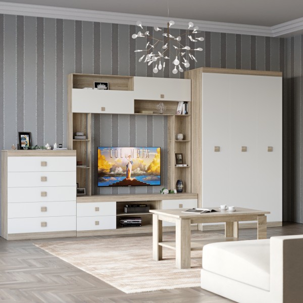 Комплект включає в себе все необхідне для організації простору: від містких шаф до зручних поличок. Ви зможете з легкістю зберігати всі ваші речі в порядку, а також створити ідеальне місце для відпочинку та розваг. Нехай ваша вітальня стане центром сімейного затишку та дружніх зустрічей!